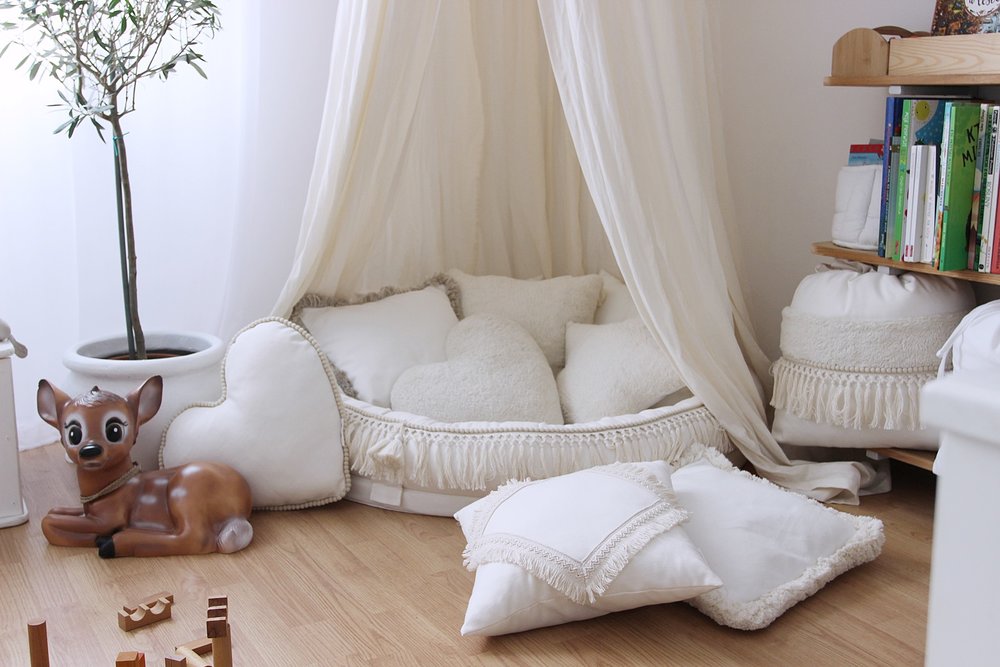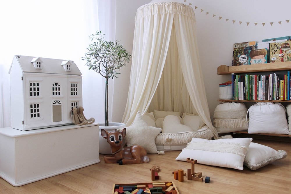 Dětské hnízdo velmi pěkně vyzní když je nad ním rozložený baldachýn.