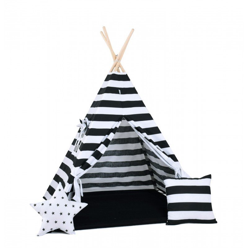 Dětský teepee stan Černo - bílý + podložka, dekorační polštářky
