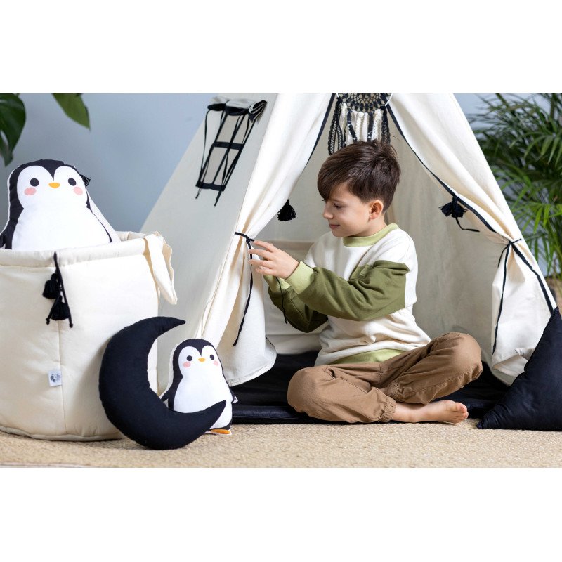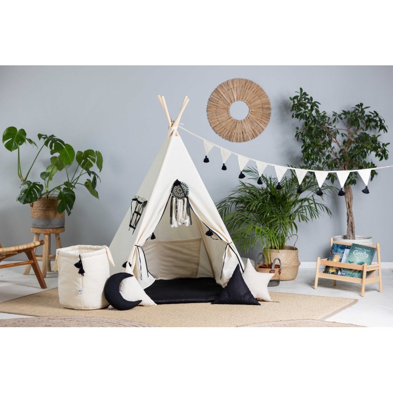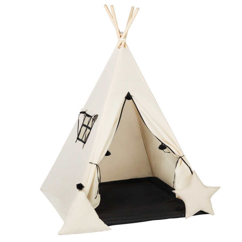 Dětský teepee stan Krémovo - černý + podložka, dekorační polštářky
