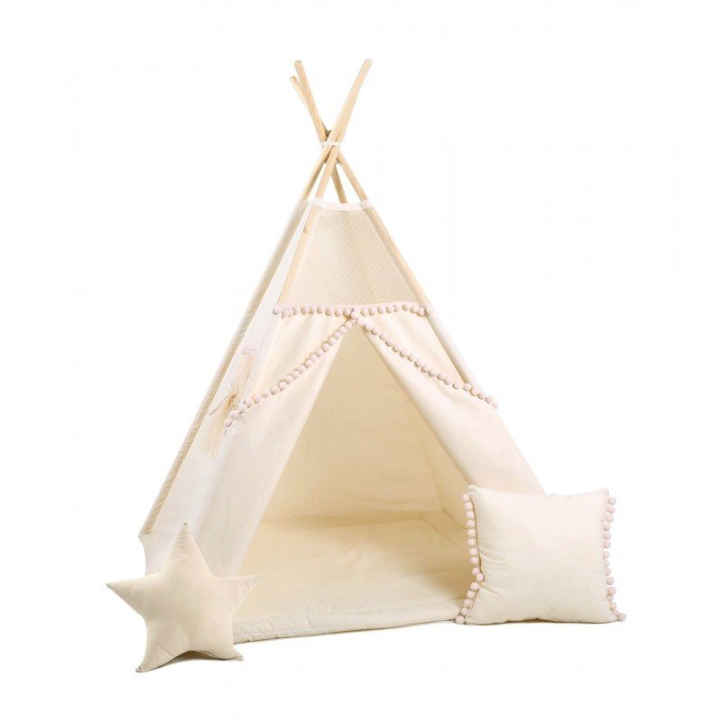 Dětský teepee stan Krémový pompem + podložka, dekorační polštářky