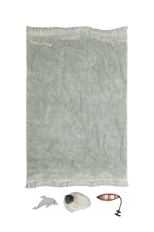 Součástí koberce je i sada ručně vyráběných hraček ( žralok, ostrůvek s palmou, loďka)