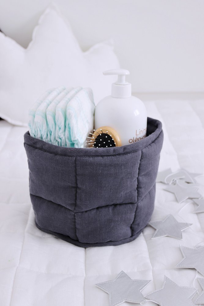 Lněný košík je šikovný pomocník. Můžete do něj uložit různé potřebné věcí pro miminko a mít je stále po ruce.