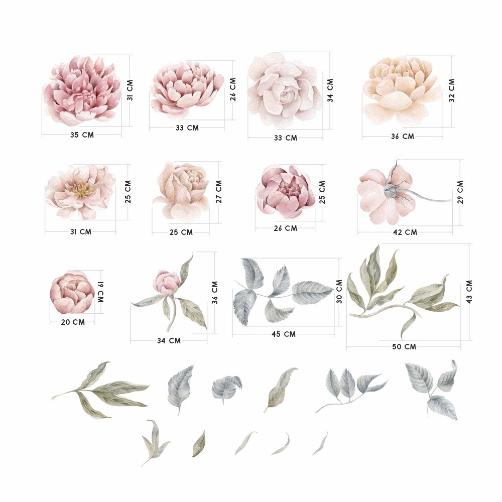 Nálepka je vytlačená na matnej fólií. Nálepku tvoria pivonky, ruže a lístky. Môže zdobiť nie len steny, ale aj nábytok a okná a vytvoriť tak jedinečný dizajn detskej izbičky.