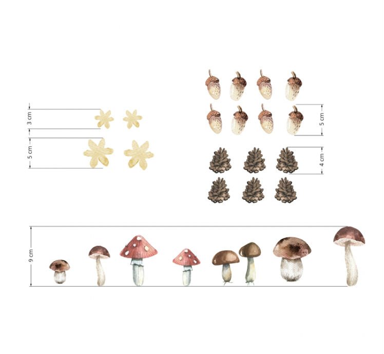 Samolepka je vytištěna na matné fólii. Samolepku tvoří kvítky, houby, koblihy a oříšky. Může zdobit nejen stěny, ale také nábytek a okna a vytvořit tak jedinečný design dětského pokojíčku.