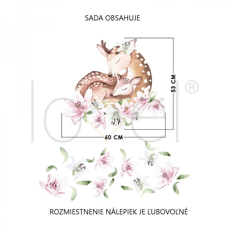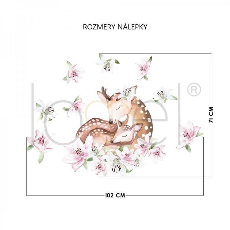 Samolepka je vytištěna na matné fólii. Samolepku tvoří pár spících jelenků, které jsou obklopeny liliemi. Může zdobit nejen stěny, ale také nábytek a okna a vytvořit tak jedinečný design dětského pokojíčku.