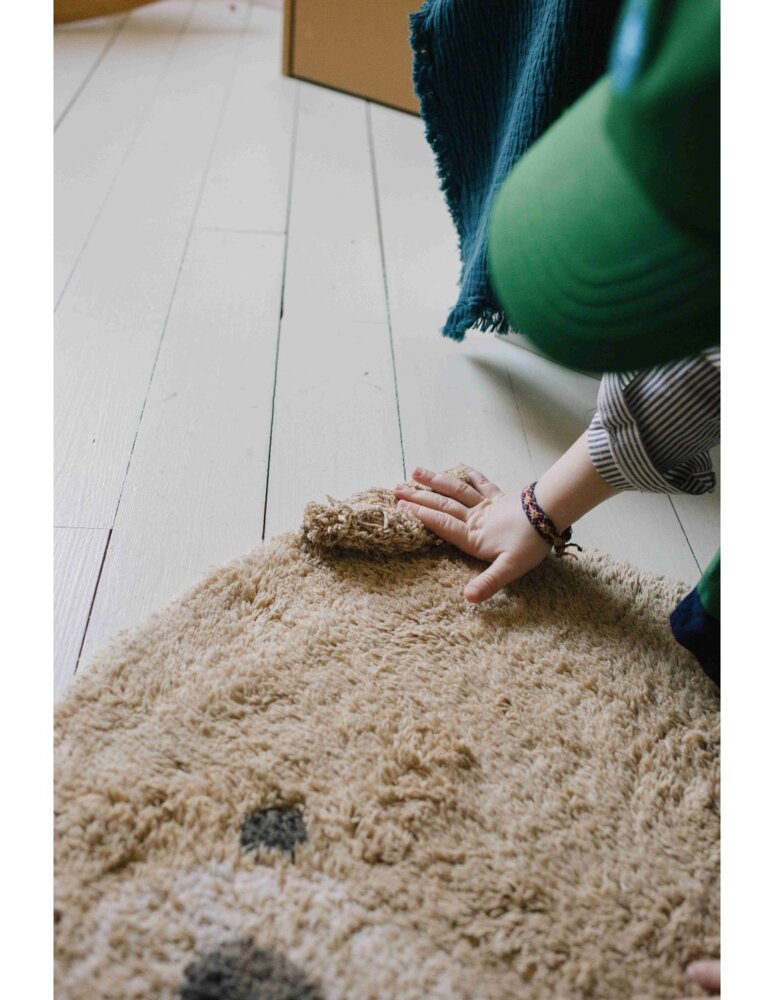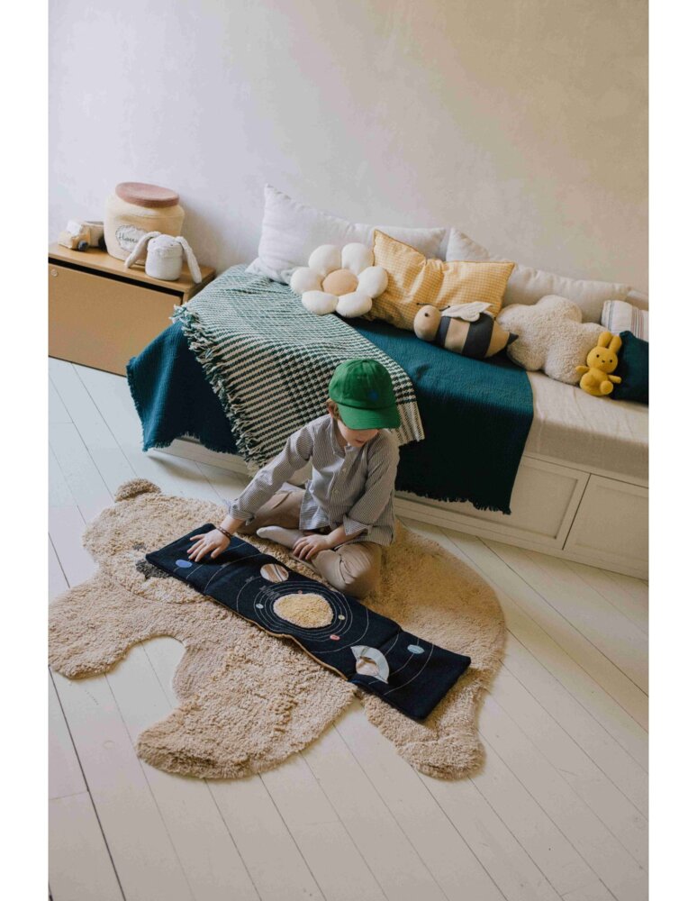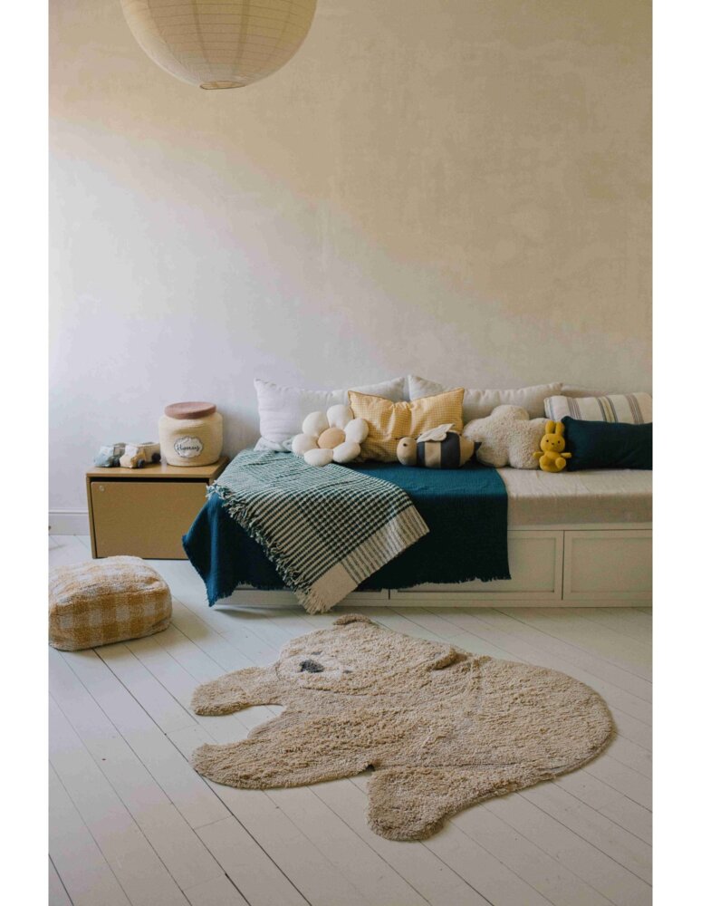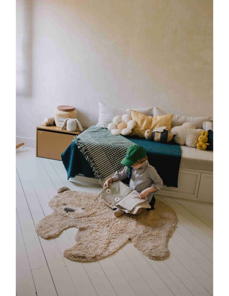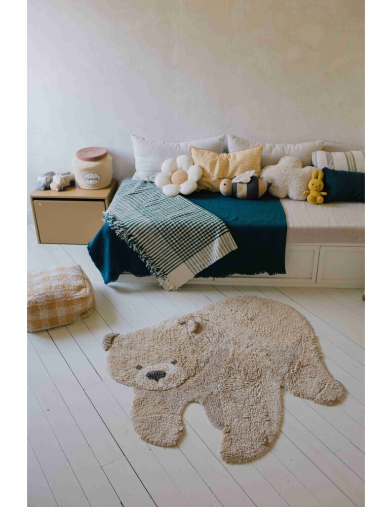 Krásný dětský koberec ve tvaru plyšového medvídka si jistě získá srdce milovníků měkkých hraček. Koberec Bear, pečlivě ručně vyrobený v jemných odstínech béžové a medové, má objemné rty, hnědé oči a trojrozměrné kožešinové uši. Díky svému realistickému designu a měkké textuře přemění každou místnost na útulný a okouzlující prostor.