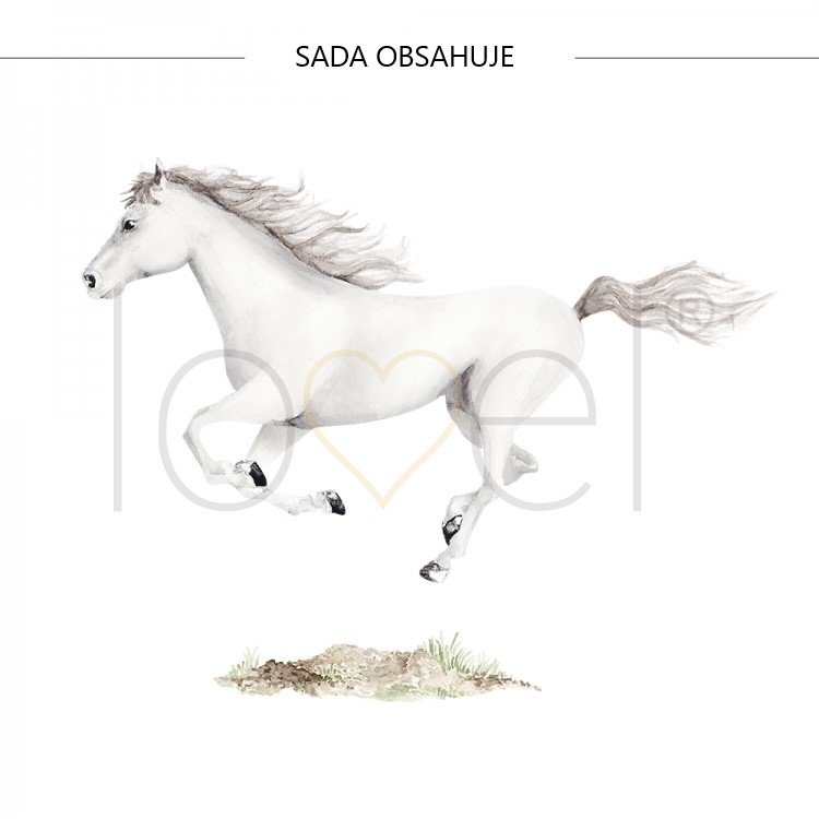 Samolepka je vytištěna na matné fólii. Samolepka obsahuje koně a zeminu. Samolepka může zdobit nejen stěny, ale také nábytek a okna a vytvořit tak jedinečný design dětského pokojíčku.