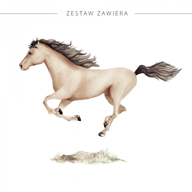 Samolepka je vytištěna na matné fólii. Samolepka obsahuje koně a zeminu. Samolepka může zdobit nejen stěny, ale také nábytek a okna a vytvořit tak jedinečný design dětského pokojíčku.