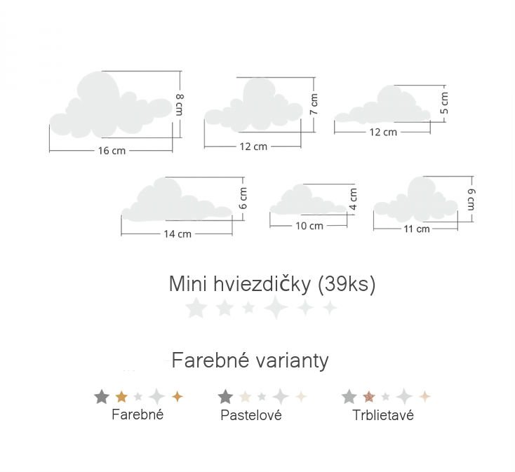 • obláčky: (š x v): 16 x 8 cm, 12 x 7 cm, 12 x 5 cm, 14 x 6 cm, 10 x 4 cm, 11 x 6 cm