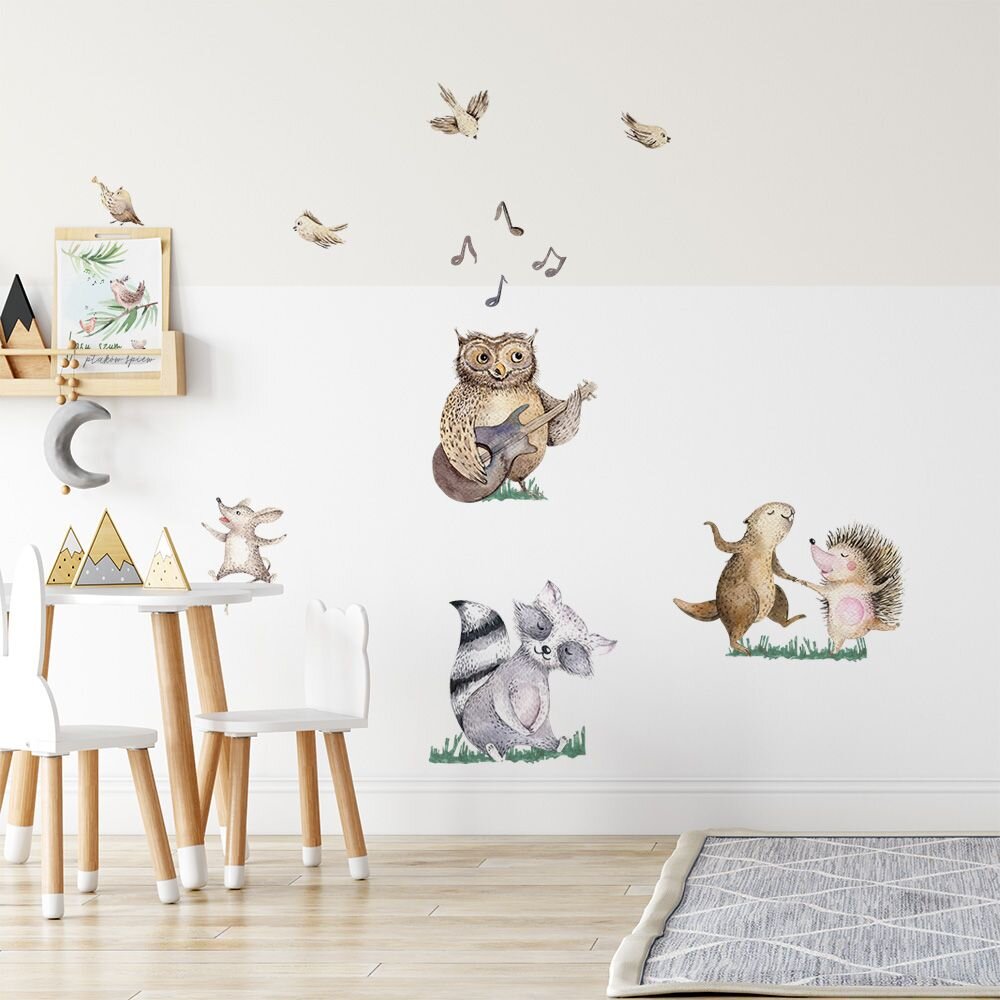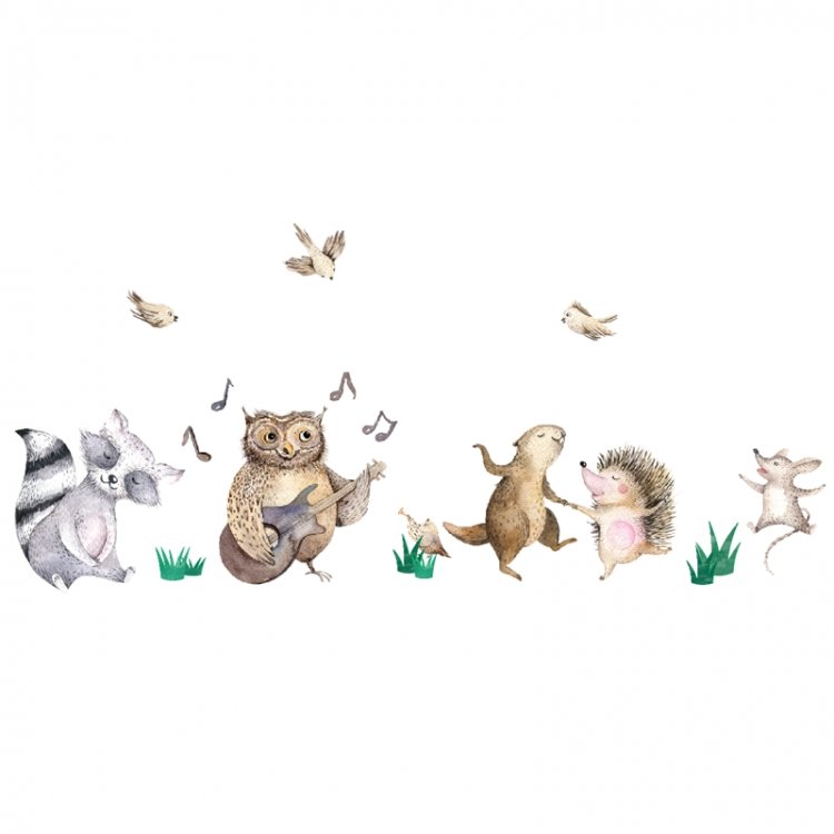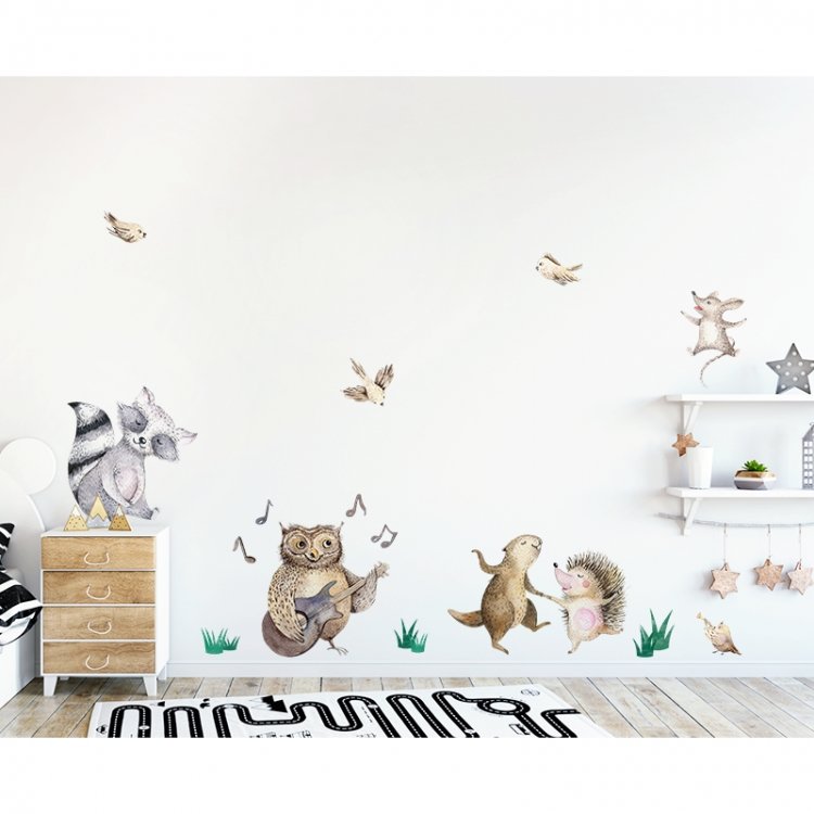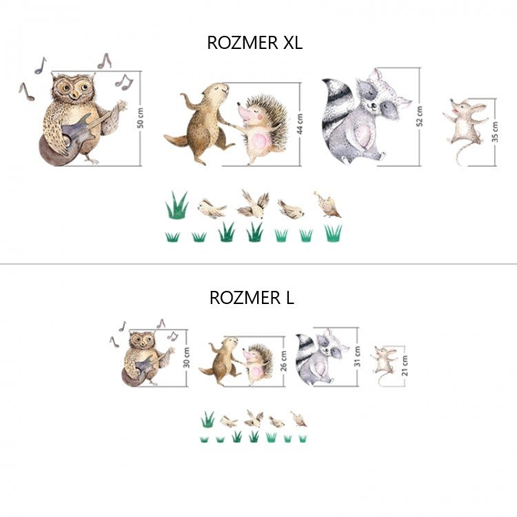 Samolepka je vytištěna na matné fólii. Samolepku tvoří sova, ježek a bobr, myška, medvídek, ptáci a trsy trávy. Samolepka může zdobit nejen stěny, ale také nábytek a okna a vytvořit tak jedinečný design dětského pokojíčku.