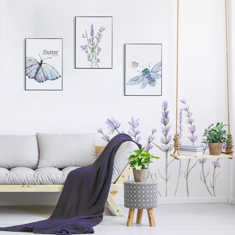 Nádherné samolepky levandulí budou vypadat skvěle a rozjasní každou místnost. Unikátní vzor dodá jedinečný design vašemu obývacímu pokoji nebo ložnici. Jako krásná romatická a neobvyklá dekorace bude úžasně dotvářet styl dětského pokoje, zároveň bude skvělým dárkem pro všechny milovníky květin a krásných interiérů.