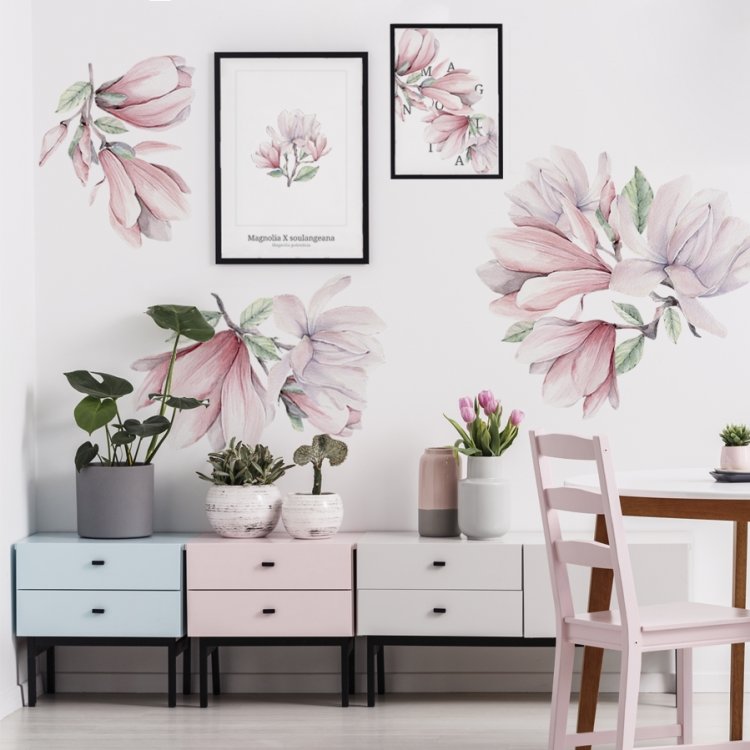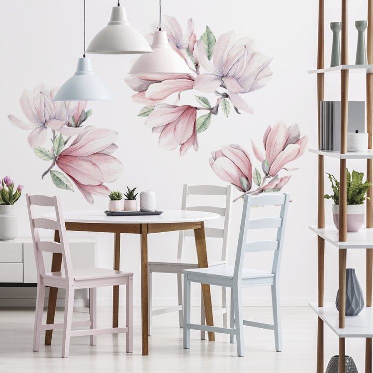 Nádherné samolepky květů magnólie rozkouzlí každou místnost. Rozkvetlé magnólie přinesou romantičnost a něžnost do každého pokojíčku.