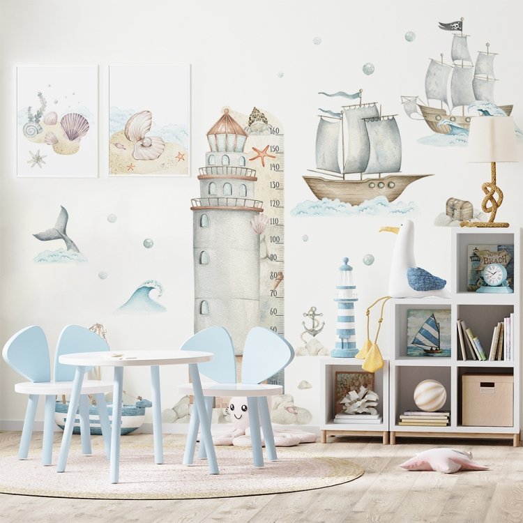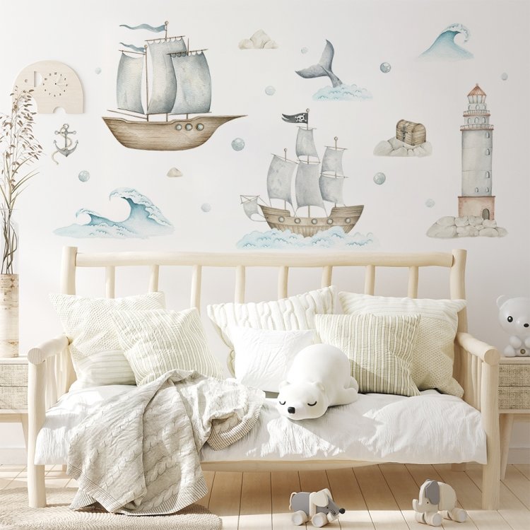 Samolepka na zeď Ocean - lodě, maják, vlny, kotva a truhla DK445