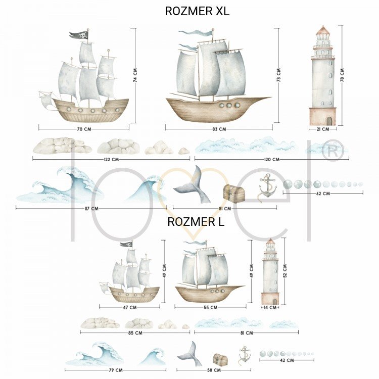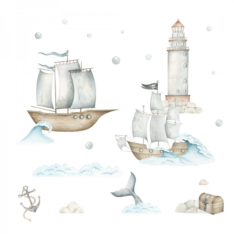 Samolepka je vytištěna na matné fólii. Samolepku tvoří lodě, maják, vlny, kotva, truhla, kameny, mořská pěna, velrybí ocas a bubliny. Samolepka může zdobit nejen stěny, ale také nábytek a okna a vytvořit tak jedinečný design dětského pokojíčku.