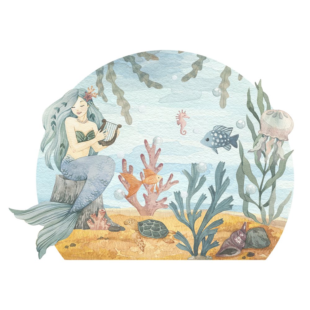Nálepka na zeď s potiskem, vyřezaná z matné fólie s motivem podmořského světa s mořskou pannou, potažená laminátem.