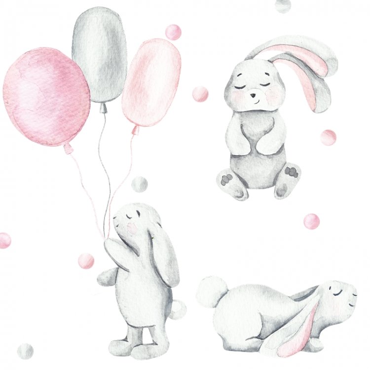 Samolepka je vytištěna na matné fólii. Samolepka obsahuje zajíčky a kuličky. Může zdobit nejen stěny, ale také nábytek a okna a vytvořit tak jedinečný design dětského pokojíčku.