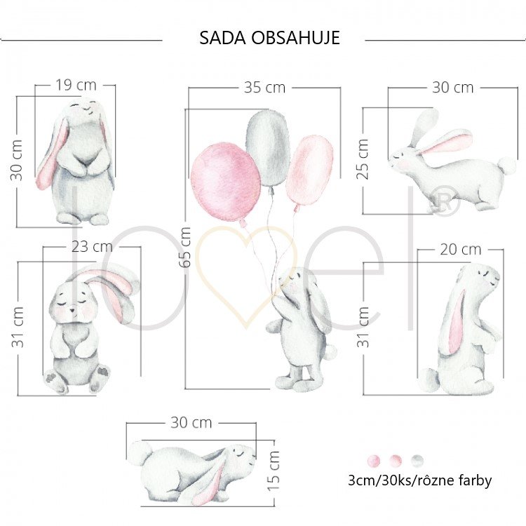 • 6x zajíčky: 30 x 19 cm, 65 x 35 cm, 25 x 30 cm, 31 x 23 cm, 31 x 20 cm, 15 x 30 cm