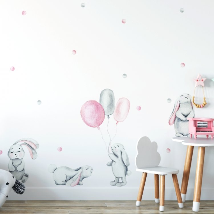 Samolepka na zeď Pastel - zajíčky a kuličky DK290 - růžové