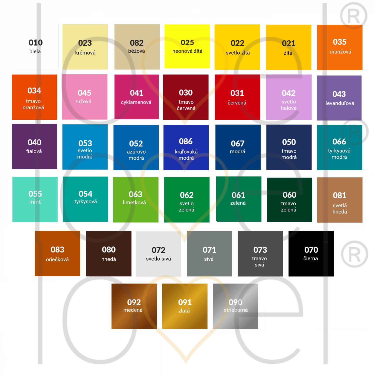 Samolepku umíme vyrobit a dodat v těchto barevných provedeních: