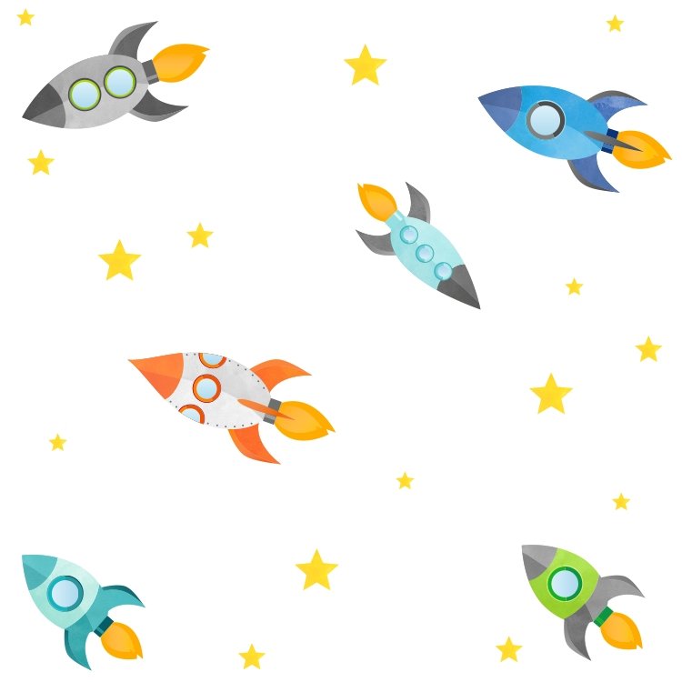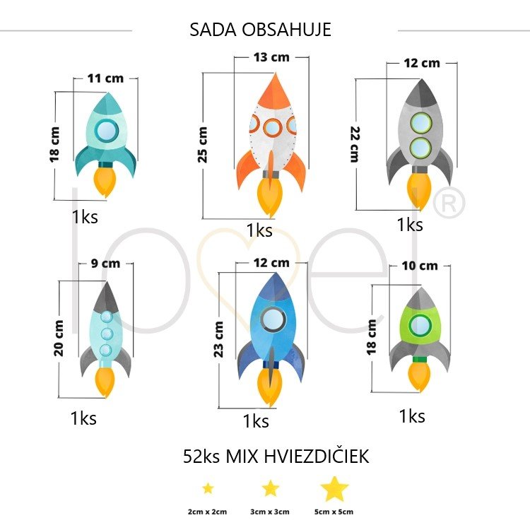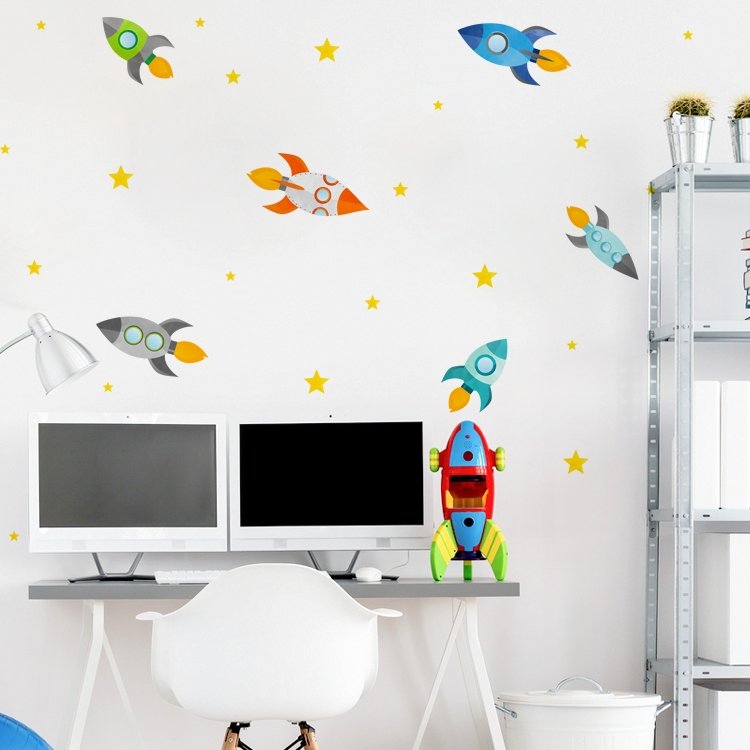 Samolepka je vytištěna na matné fólii. Samolepku tvoří rakety a hvězdičky. Samolepka může zdobit nejen stěny, ale také nábytek a okna a vytvořit tak jedinečný design dětského pokojíčku.