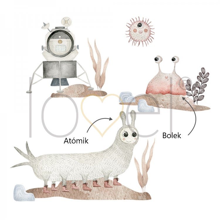 Samolepka je vytištěna na matné fólii. Samolepku tvoří přátelé Atomik a Bolek, ostrůvky, vesmírná loď, vesmírná příšerka, kameny a trávy. Samolepka může zdobit nejen stěny, ale také nábytek a okna a vytvořit tak jedinečný design dětského pokojíčku.