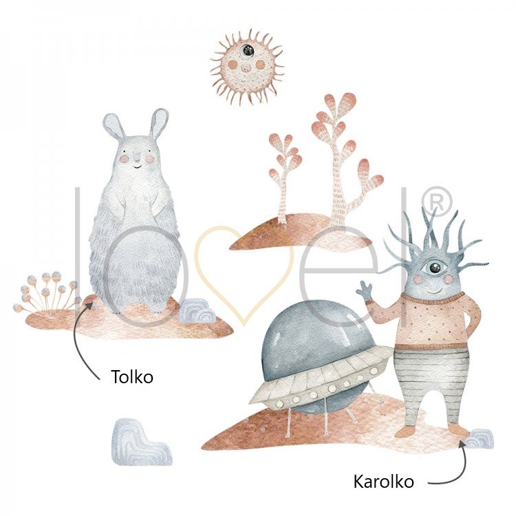 Samolepka je vytištěna na matné fólii. Samolepku tvoří přátelé Karolko a Tolko, ostrůvky, ufo, kameny a trávy. Samolepka může zdobit nejen stěny, ale také nábytek a okna a vytvořit tak jedinečný design dětského pokojíčku.