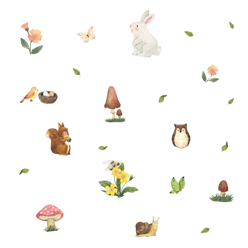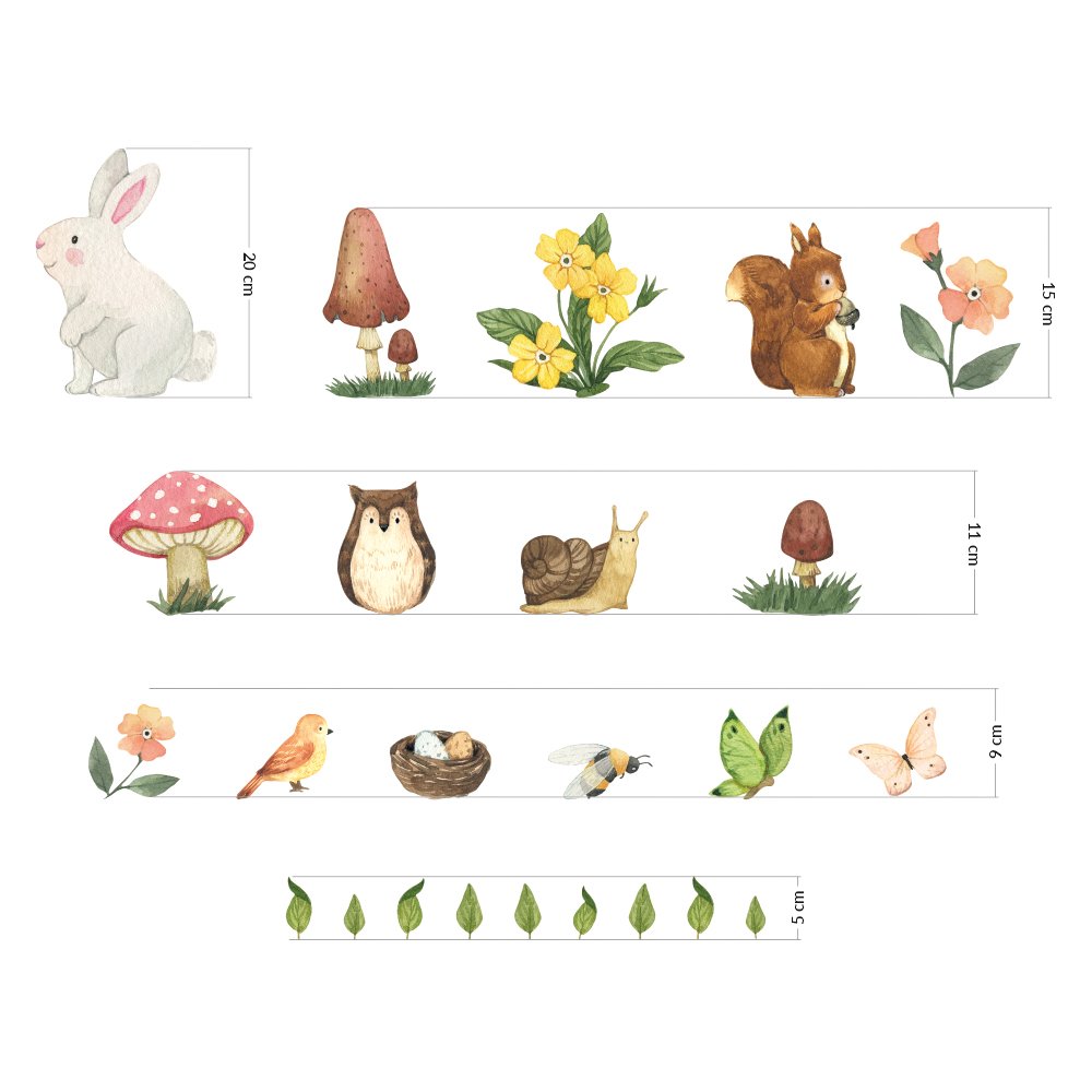 Nálepka je vytištěna na matné fólii. Nálepku tvoří 24 ks různých lesních vzorů: květiny, lístky a lesní zvířátka. Může zdobit nejen stěny, ale i nábytek a okna a vytvořit tak jedinečný design dětského pokojíčku.
