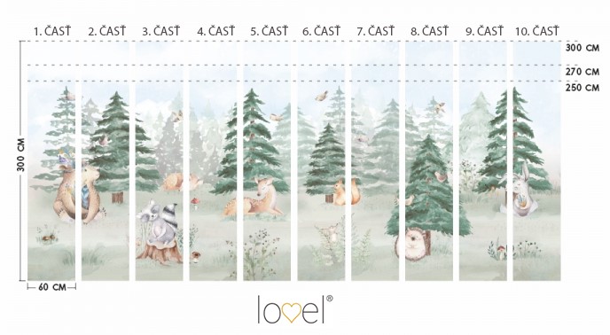 Celá tapeta se skládá z 10-ti částí, díky kterým se hodí i na stěnu velmi dlouhých místností (max.6 metrů dlouhých). Každá část tapety má šířku 60 cm, a proto je jen na vás, které části z tapety si vyberete.